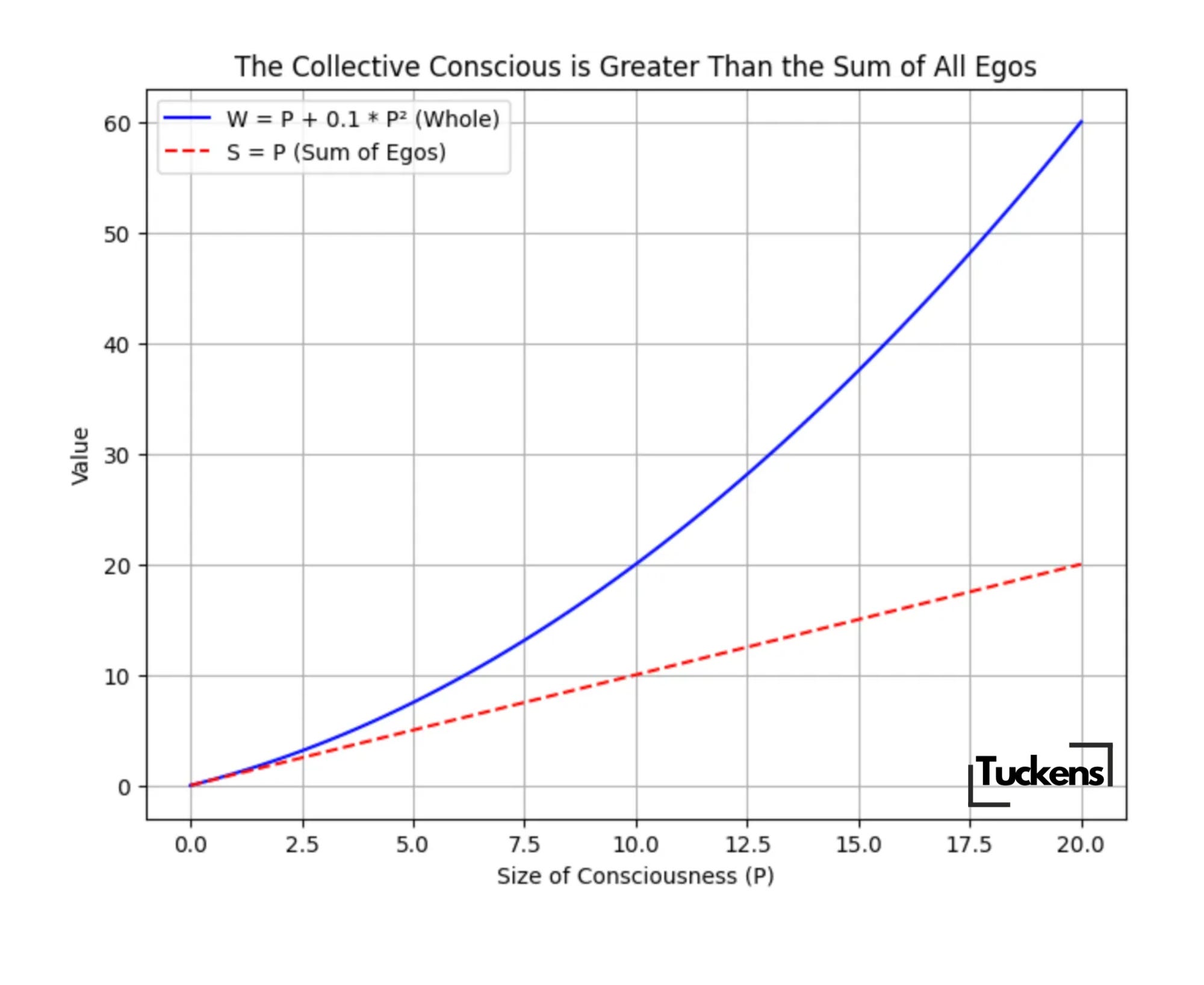 We are in individual bodies while also being a part of a greater collective; both physically through society and metaphysically through the spiritual world. When we cultivate our egos, it is not mere selfishness, as many assume, but rather a process through which our own growth contributes to the advancement of the world. The law is simple; I is connected to the size of WE; when I grows so does WE by the sum of the part plus an amplification factor. The whole is then greater than the sum of its parts, amplified by the change in any one ego.