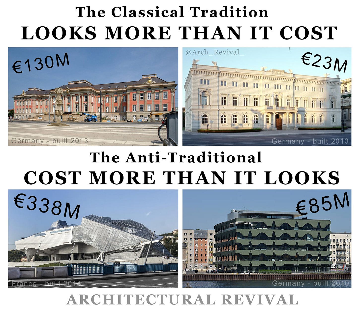 The same Swedish study cited above also found that, in Sweden, house developers can satisfy people’s aesthetic preferences “cost-effectively.” That is, modernist buildings are not cheaper than classical ones, at least not enough to treat them as the obvious economic option.